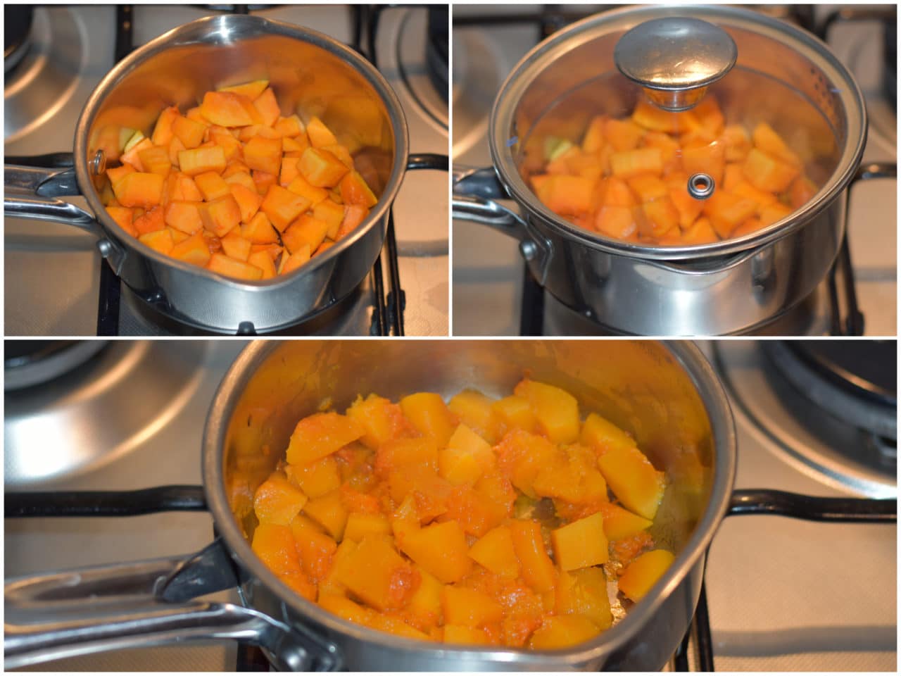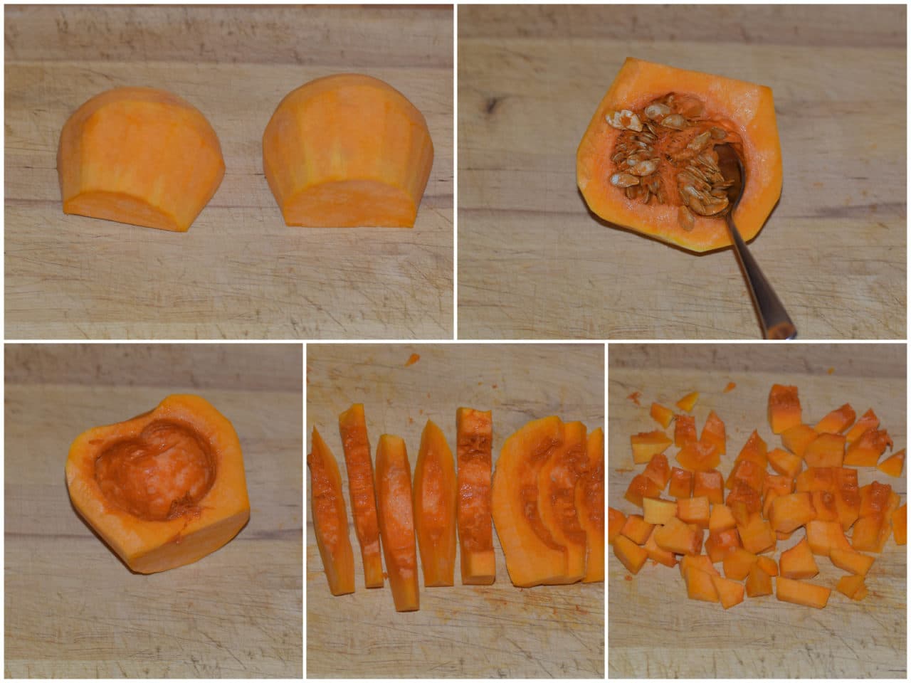 Innanzitutto mondate la zucca e tagliatela a cubetti.