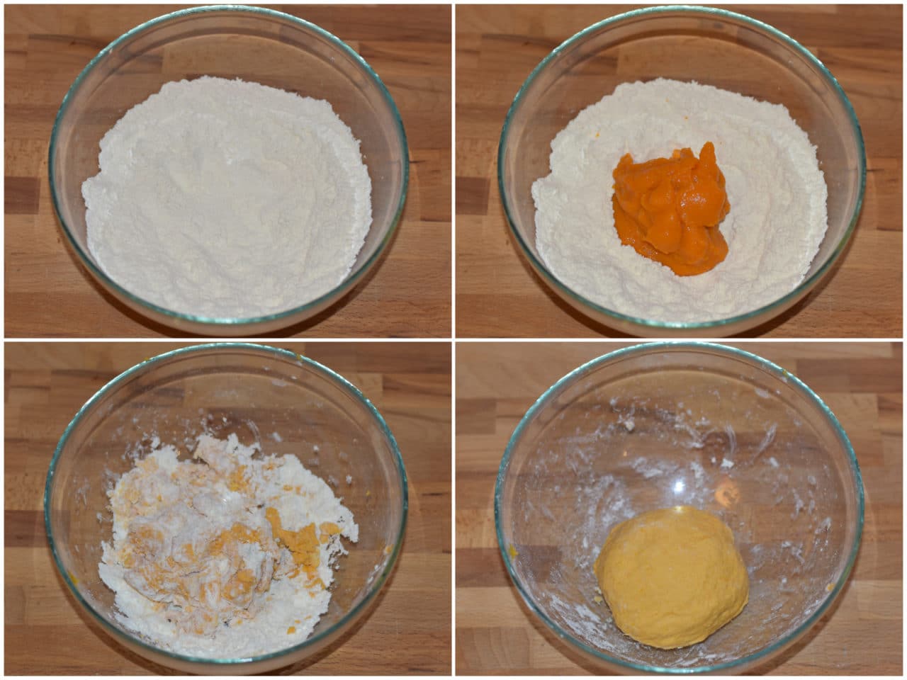 Mettete la farina in una ciotola, aggiungete al centro la purea di zucca e un pizzico di sale e impastate velocemente fino ad ottenere un panetto omogeneo.