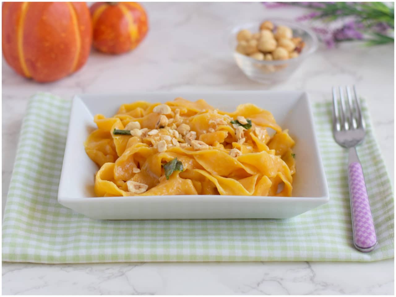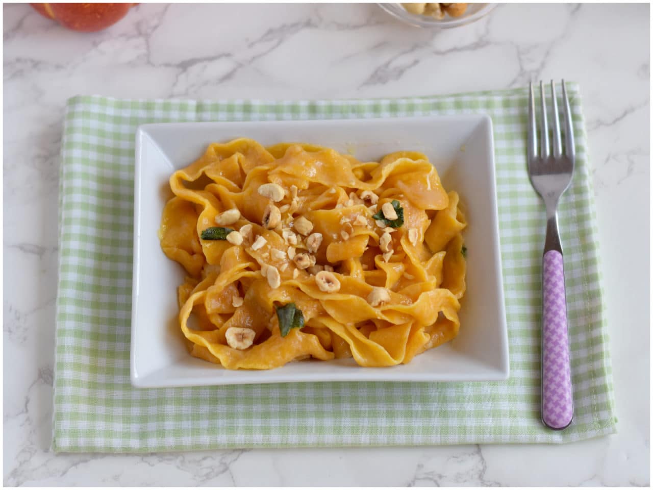 Le tagliatelle di zucca sono pronte, non vi resta che impiattare, completare con le nocciole e servire.