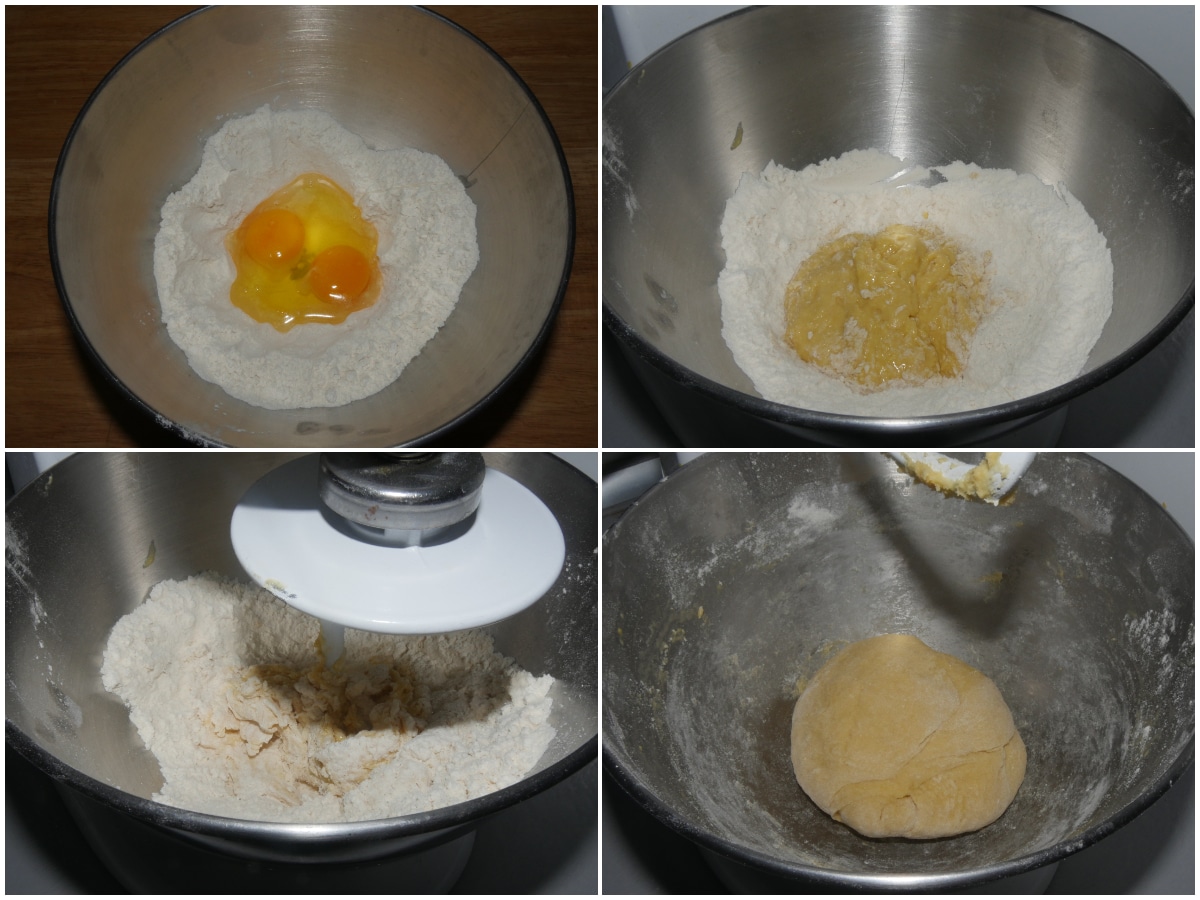 Mettete la farina a fontana in una ciotola, versate le uova al centro e iniziate a sbattere leggermente con la forchetta, incorporando man mano la farina nelle uova, lavorando velocemente fino ad ottenere un panetto omogeneo.