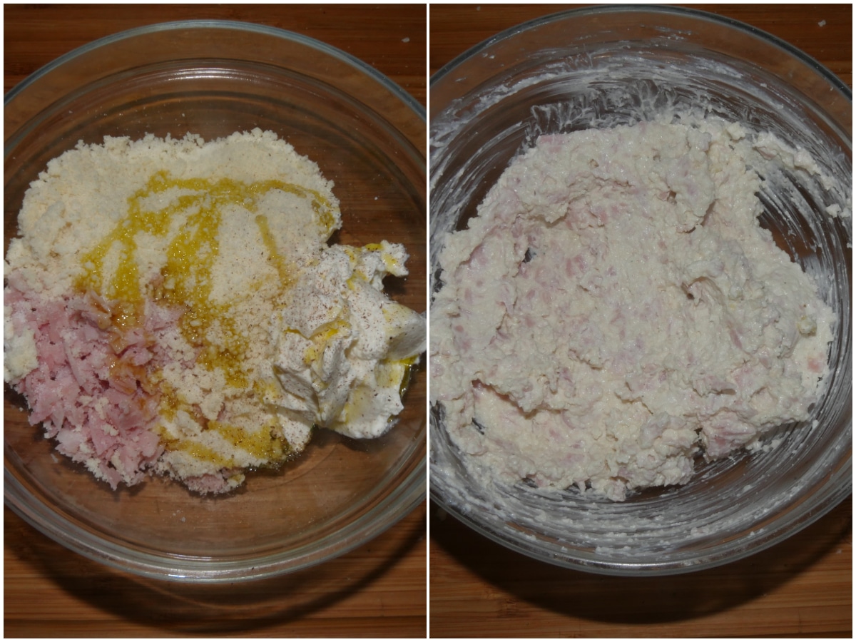 Nel frattempo preparate il ripieno: unite in una ciotola ricotta, prosciutto sminuzzato, parmigiano, noce moscata, un pizzico di sale e un filino d'olio, e amalgamate.