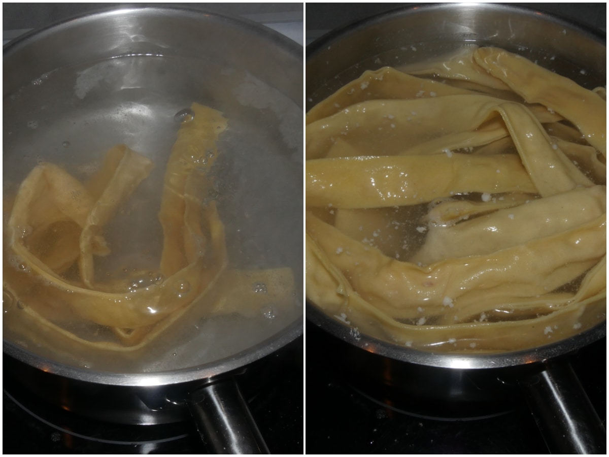 A questo punto potete cuocerle, in abbondante acqua bollente già salata: basteranno 3 minuti circa (5 al massimo, dipende dallo spessore della pasta) e potrete scolarle e condirle a piacere.