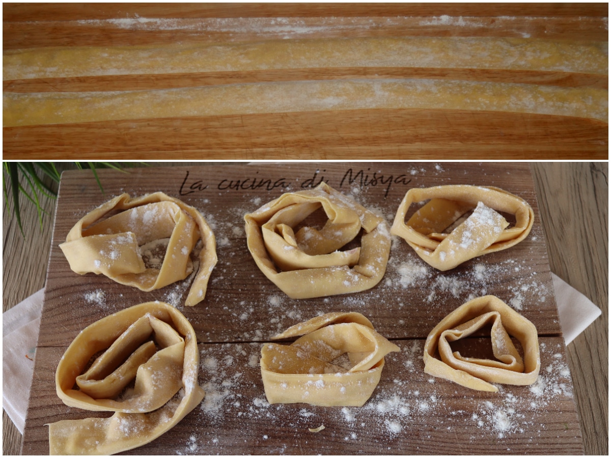 Infine, tagliate con una rotella per la pasta o un coltello a lama liscia in strisce larghe non più di 2-3 cm, in modo da ottenere le tagliatelle: disponetele su di un tagliere leggermente infarinato e cospargetele con poca farina, in modo che non si attacchino.