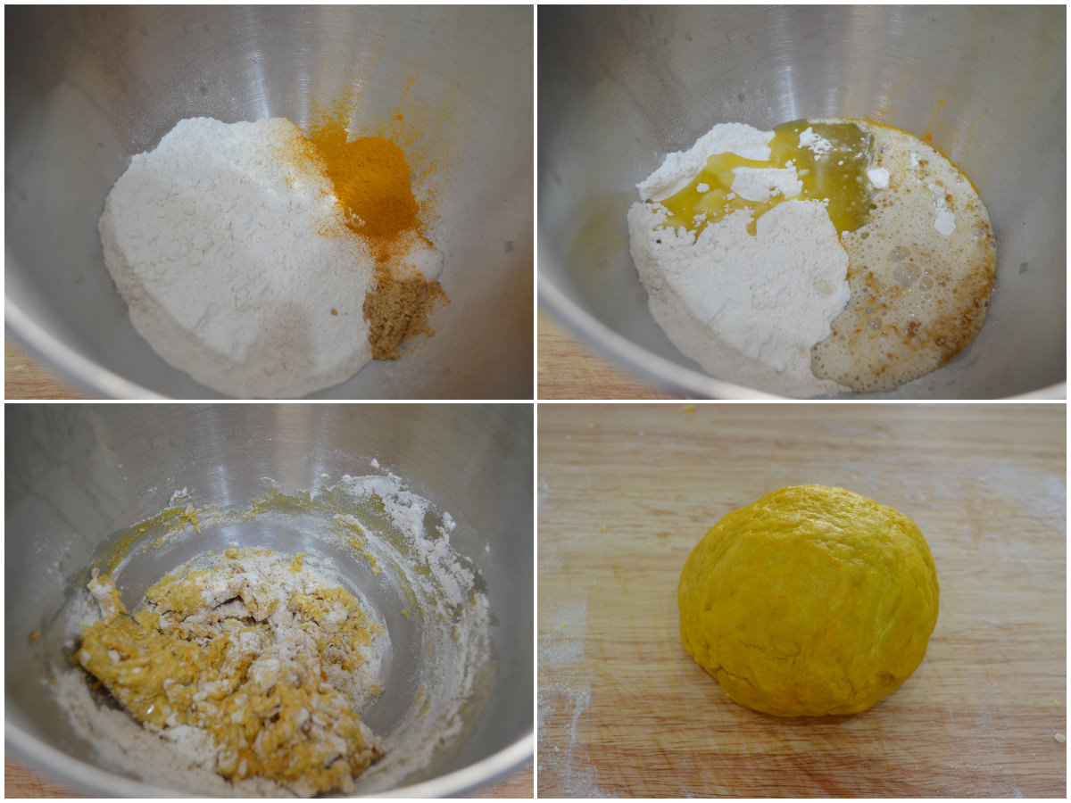 Mettete in una ciotola farina, sale, zenzero, curcuma, sale vino e olio e amalgamate fino ad ottenere un panetto liscio e uniforme.