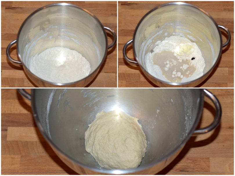 Innanzitutto preparate l'impasto: sciogliete il lievito nell'acqua appena tiepida, poi unitelo alla farina insieme con margarina, zucchero e vaniglia e lavorate fino ad ottenere un panetto omogeneo.