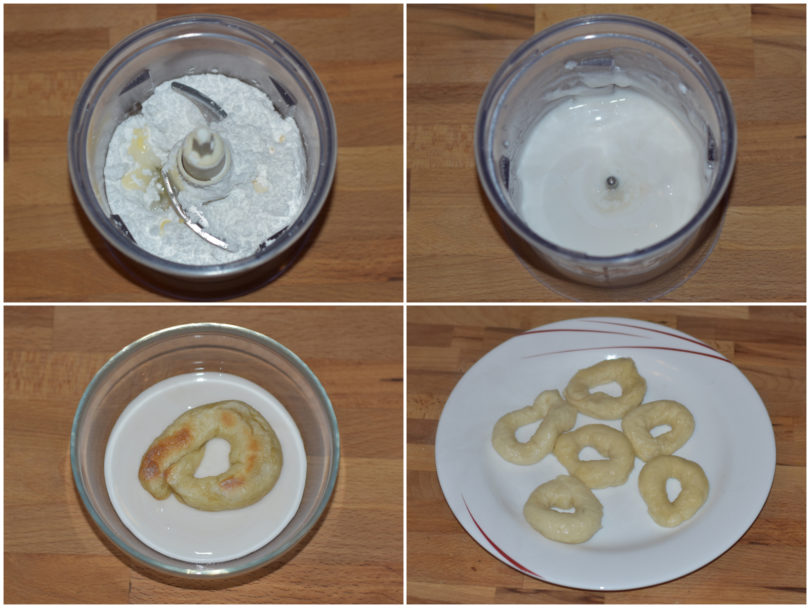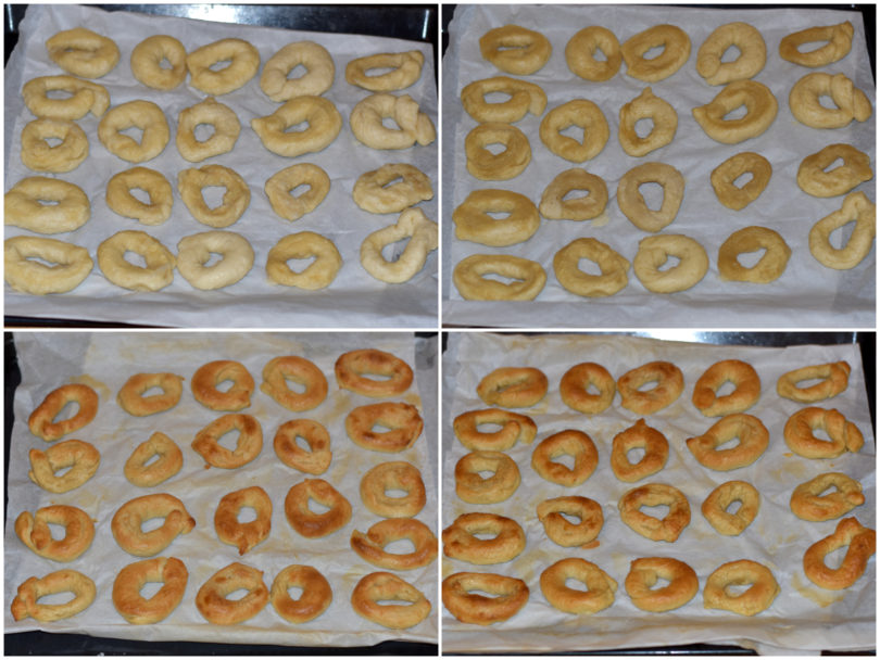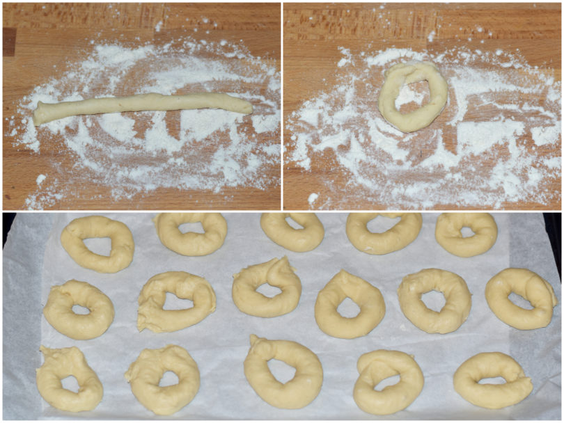 Prendete un pezzo di impasto per volta (circa 30-40 gr), arrotolatelo con le mani sul piano di lavoro per creare un cordoncino spesso 1-1,5 cm e chiudetelo ad anello, poi proseguite analogamente con il resto dell'impasto e lasciate lievitare per altri 20 minuti.
