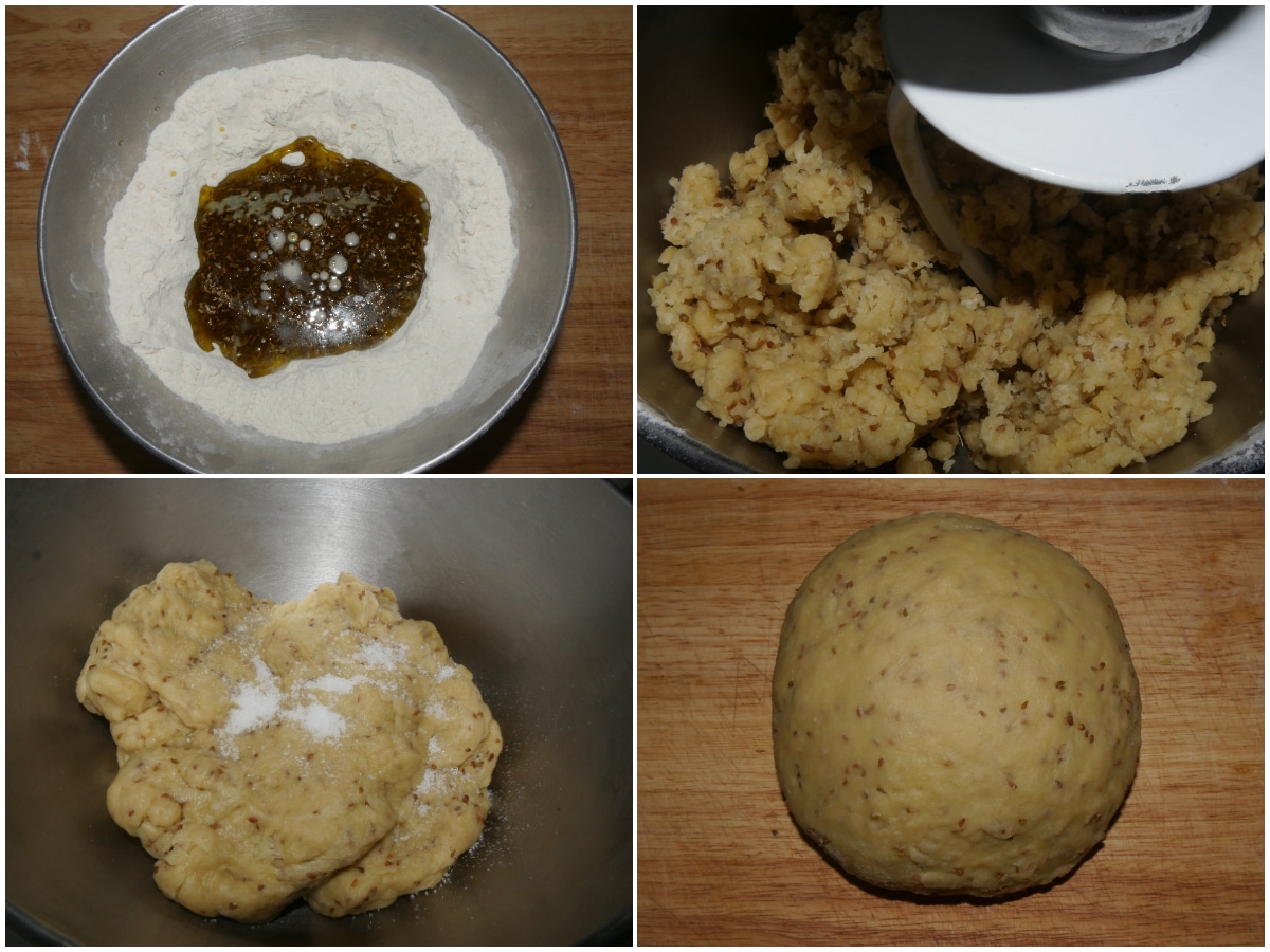 Mettete la farina a fontana in una ciotola, aggiungete semi di anice, acqua con lievito sciolto, vino e olio e iniziate a impastare, infine incorporate anche il sale e lavorate fino ad ottenere un panetto omogeneo.