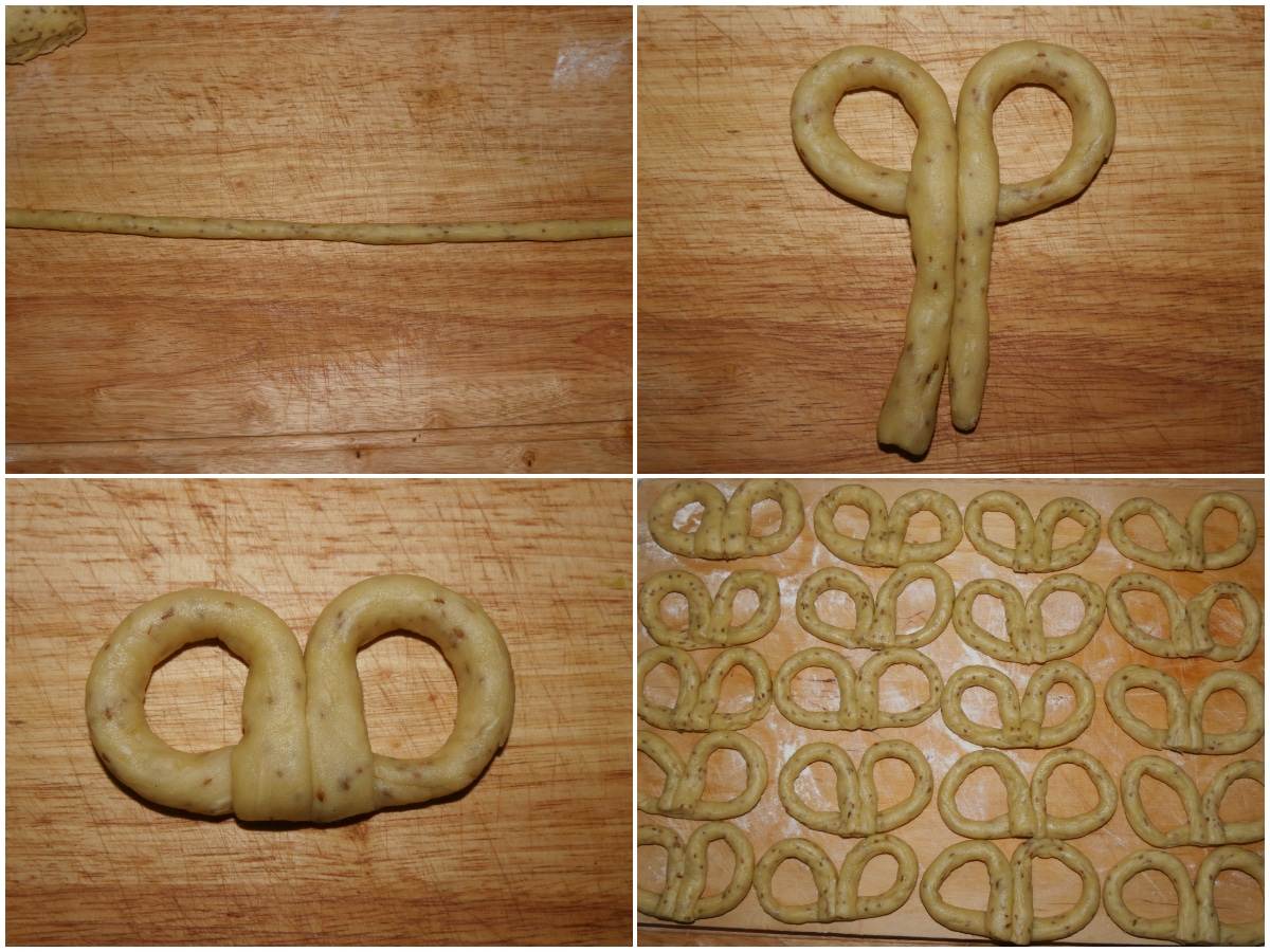 Dividete l'impasto in 20-30 pezzi tutti uguali, ricavate dei cordoncini e intrecciateli come preferite per creare i vostri taralli.