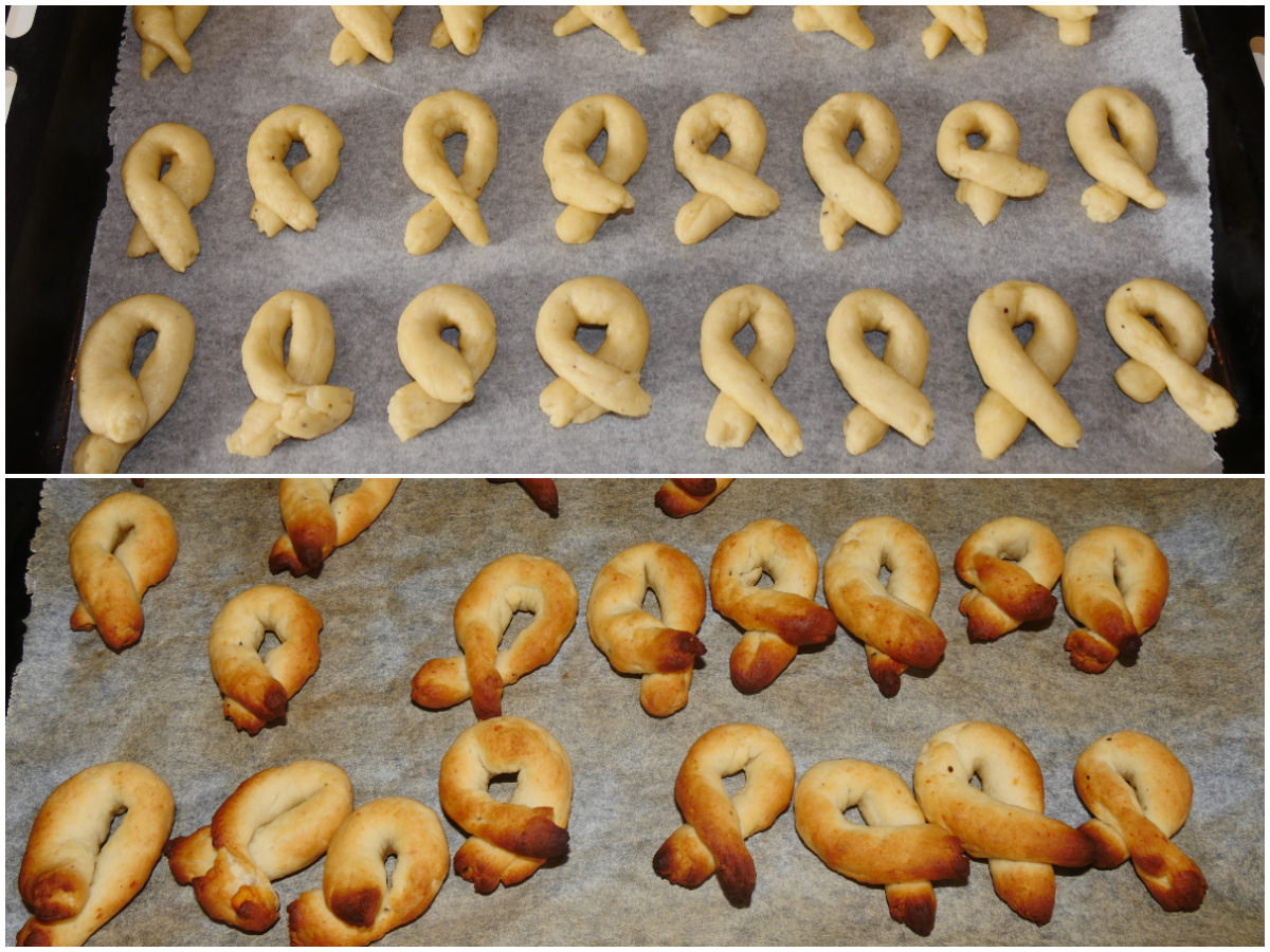 Man mano che sono pronti, disponete i taralli sulla teglia del forno rivestita di carta forno.