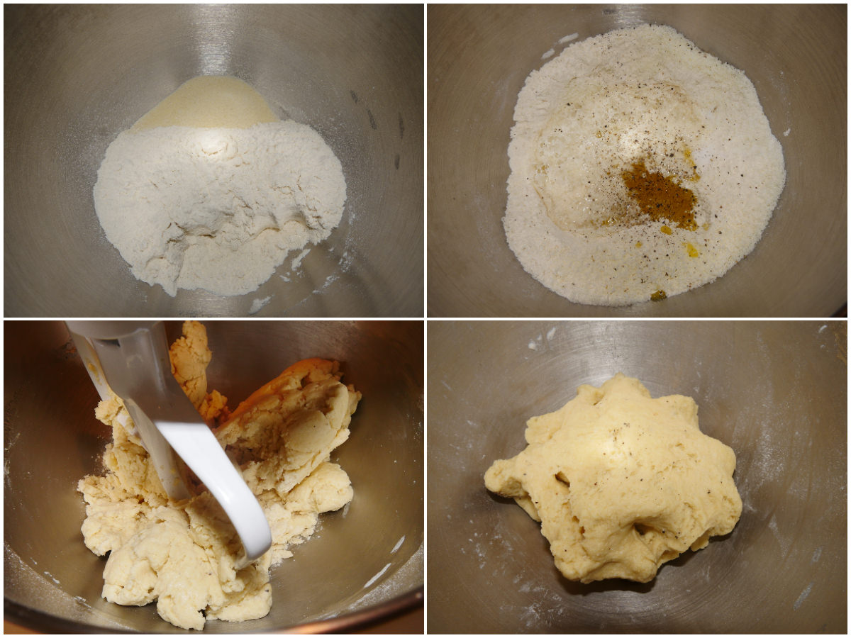 Mettete in una ciotola farina e semola e mescolate, poi aggiungete pecorino, sale, pepe, olio e vino e impastate fino ad ottenere un panetto liscio ed elastico.