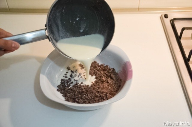 In un pentolino dal fondo spesso fate bollire la panna con il latte e non appena arriverà al punto di ebollizione, versate tutto sul cioccolato fondente tritato