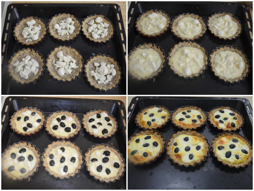 Sbriciolate la mozzarella nelle tartellette, coprite con il composto di uova e guarnite con olive tagliate a metà.