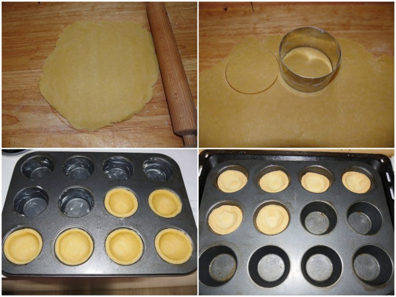 Con un coppapasta da 10 cm, ricavate dei dischetti, inseriteli in stampini per muffin imburrati, cercando di foderare bene gli stampini con la frolla per formare dei cestini, e cuocete per 10-15 minuti in forno ventilato preriscaldato a 180°C.