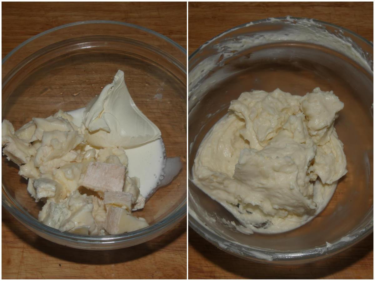 Mescolate in una ciotola mascarpone, gorgonzola spezzettato e champagne (se volete potete aggiungere un pizzico di sale), quindi lasciatela in frigorifero per 1 ora.