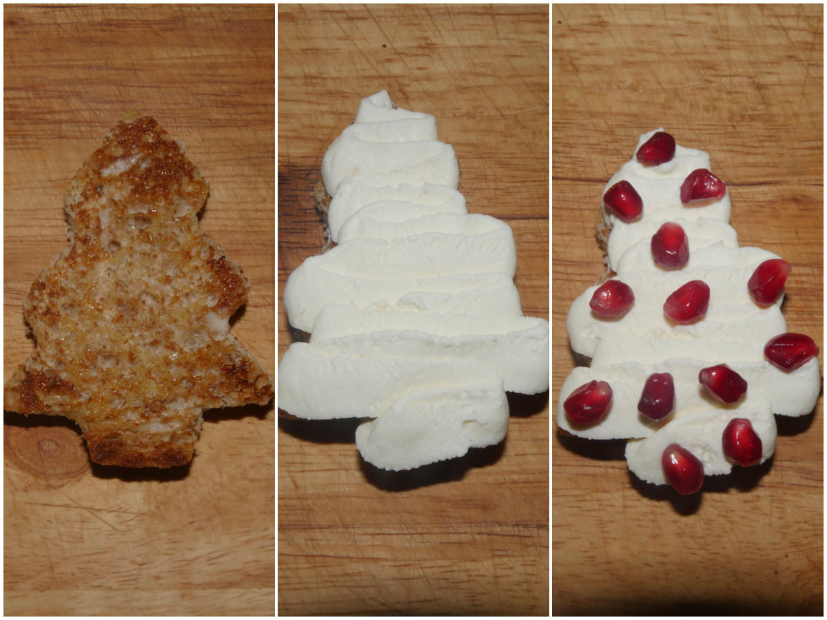 Fate intiepidire le tartine, riprendete la crema dal frigo, mescolatela velocemente e usatela per farcire le tartine (per un effetto più ordinato usate una sac-à-poche come ho fatto io) e decorate con i chicchi di melograno.