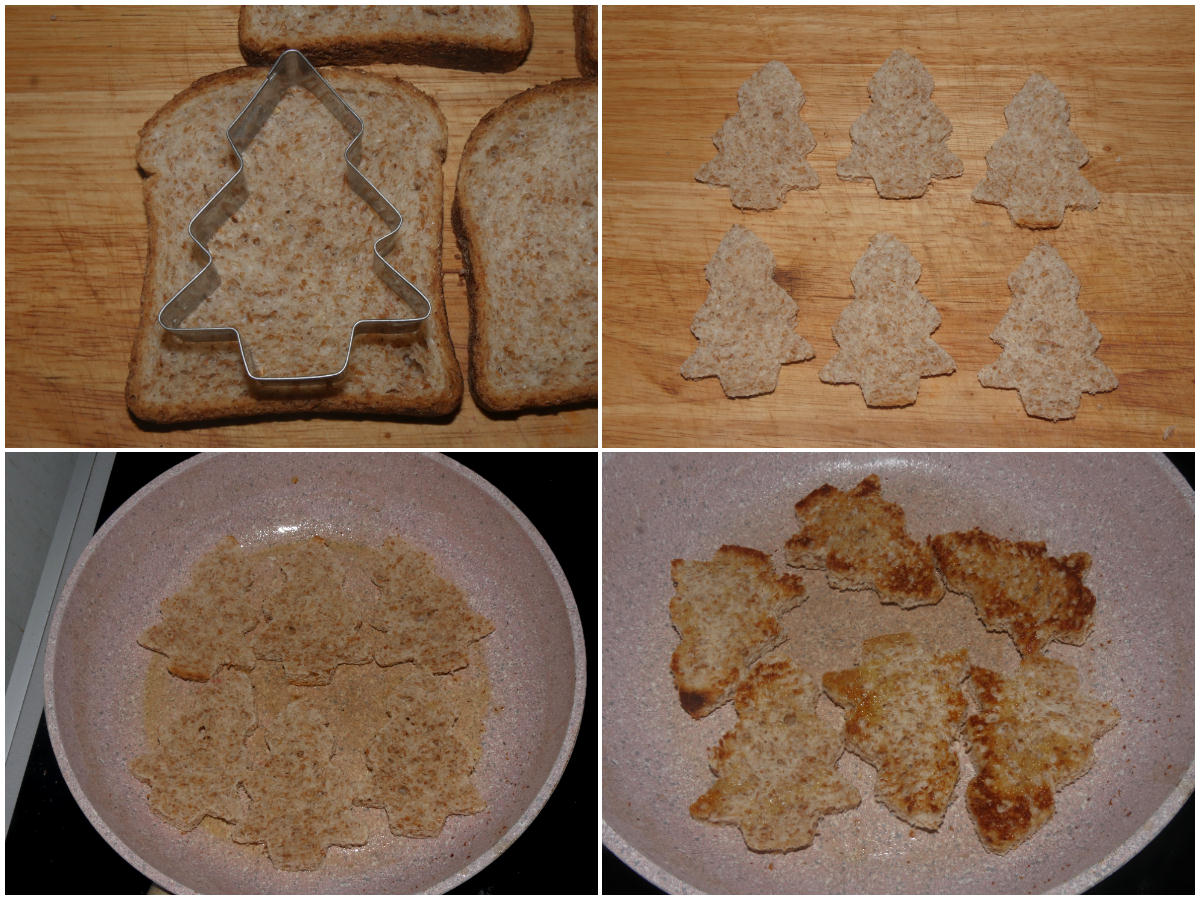 Ricavate gli alberelli dal pane e tostateli leggermente in una padella antiaderente.