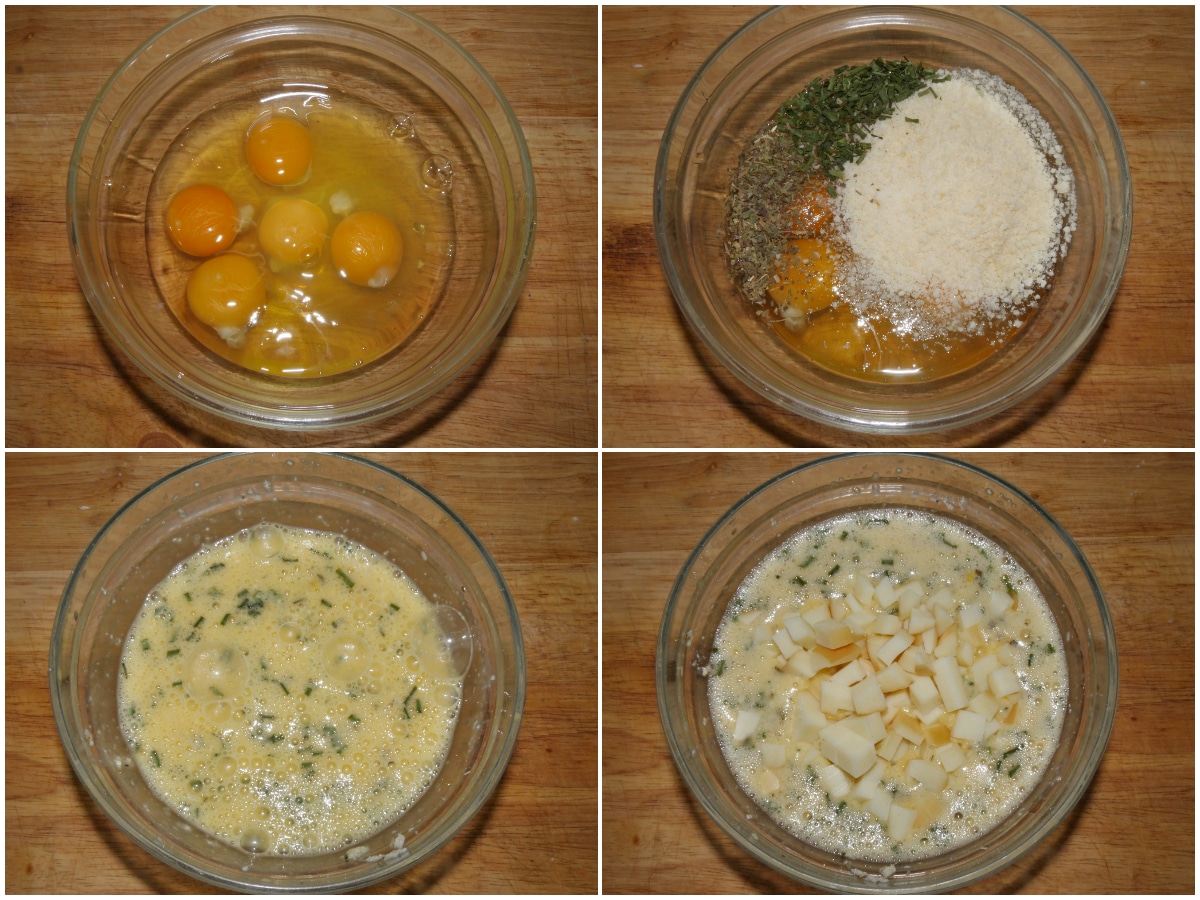 Preparate la frittata: sbattete le uova con sale, parmigiano, prezzemolo ed erba cipollina tritati, quindi unite la scamorza a pezzetti.