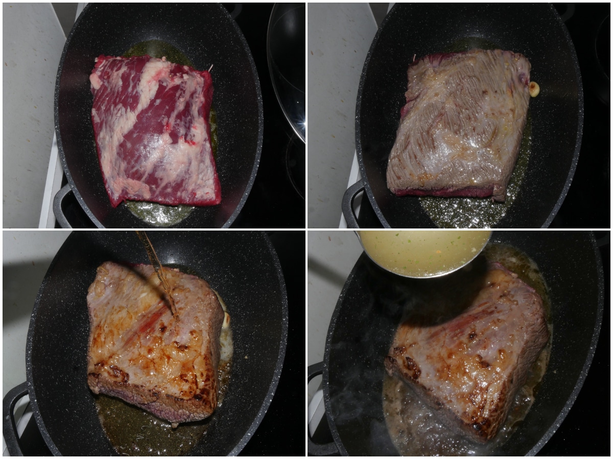 Fate dorare l'aglio con l'olio in una casseruola abbondante, quindi fate rosolare anche la carne, per 10-15 minuti, girandola da tutti i lati per sigillarli tutti, poi sfumate con il vino bianco e, una volta evaporato, aggiungete il brodo.