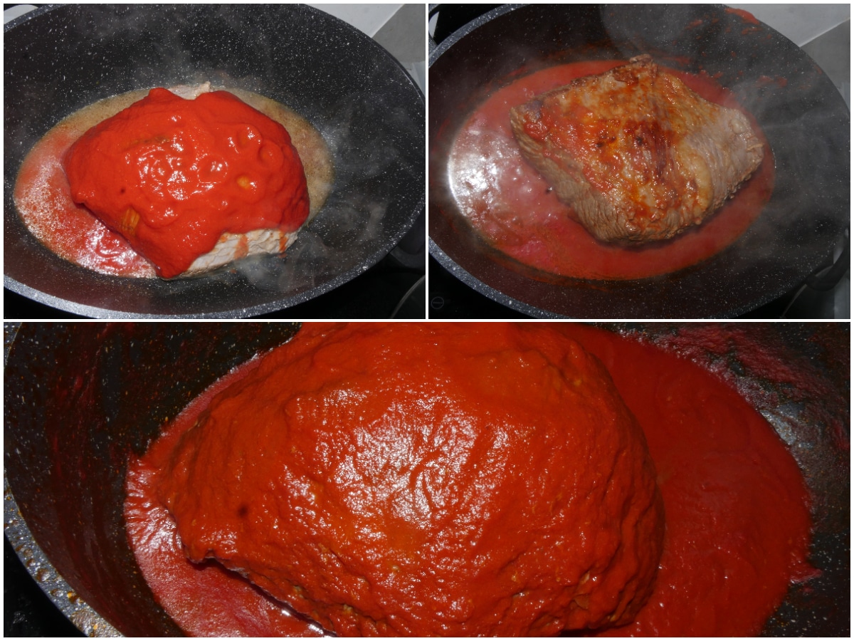Aggiungete la passata, salate e cuocete a fiamma moderata per 20-25 minuti, girandola a metà cottura e irrorandola ogni tanto con il sugo.