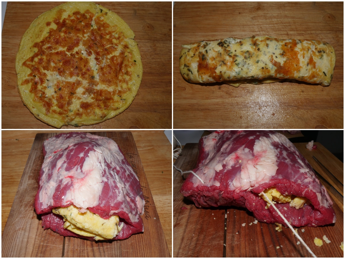 Arrotolate la frittata e inseritela dentro la tasca, sigillandola poi con dello spago da cucina (o degli stuzzicadenti) in modo che non fuoriesca in cottura.