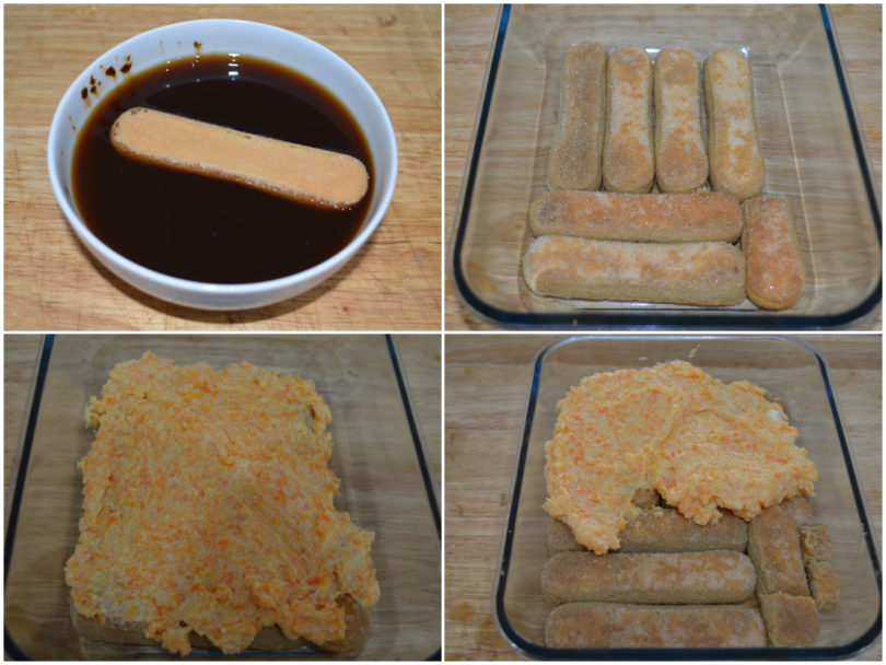 Continuate ad alternare strati di savoiardi bagnati nel caffè con strati di crema, concludendo con la crema.