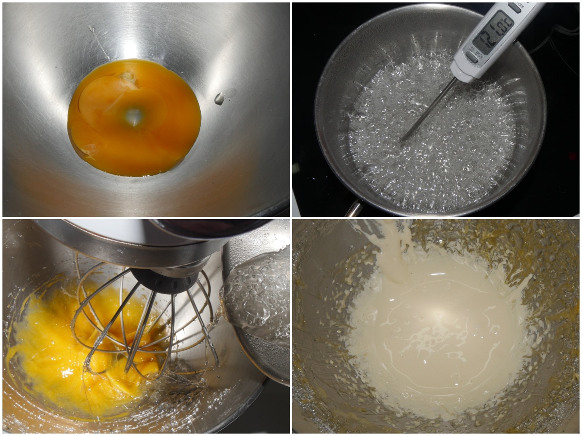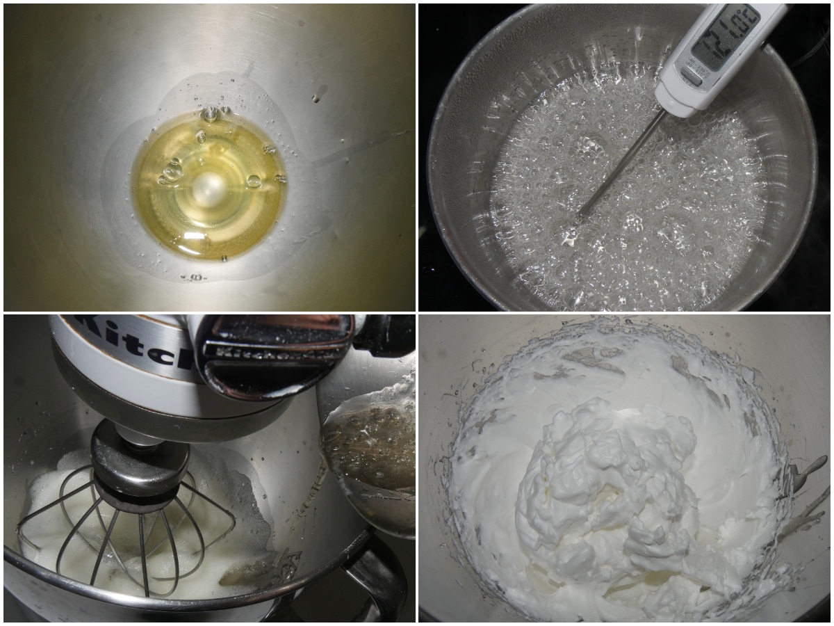 Fate la stessa cosa con gli albumi: mettete a fare lo sciroppo (25 gr di acqua e 25 gr di zucchero), poi iniziate a montare e, quando saranno mezzi montati, iniziate a versarvi lo sciroppo bollente a filo, continuando a montare finché il composto non si sarà raffreddato.