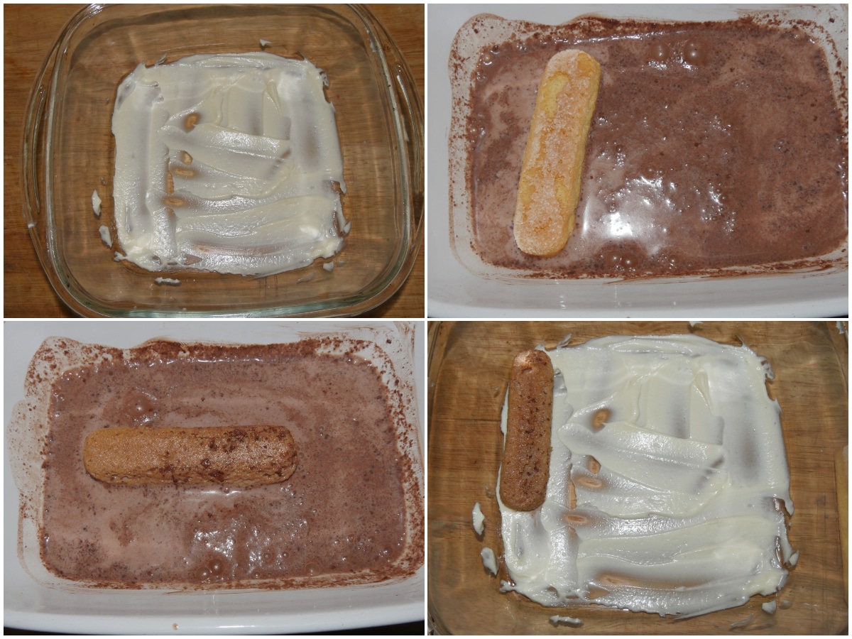 Sciogliete il cacao nel latte, quindi assemblate il dolce: mettete un leggero strato sul fondo della pirofila, poi, uno per volta, bagnate i savoiardi nel latte e cacao e disponeteli ordinatamente nella pirofila, uno affianco all'altro, senza sovrapporli.