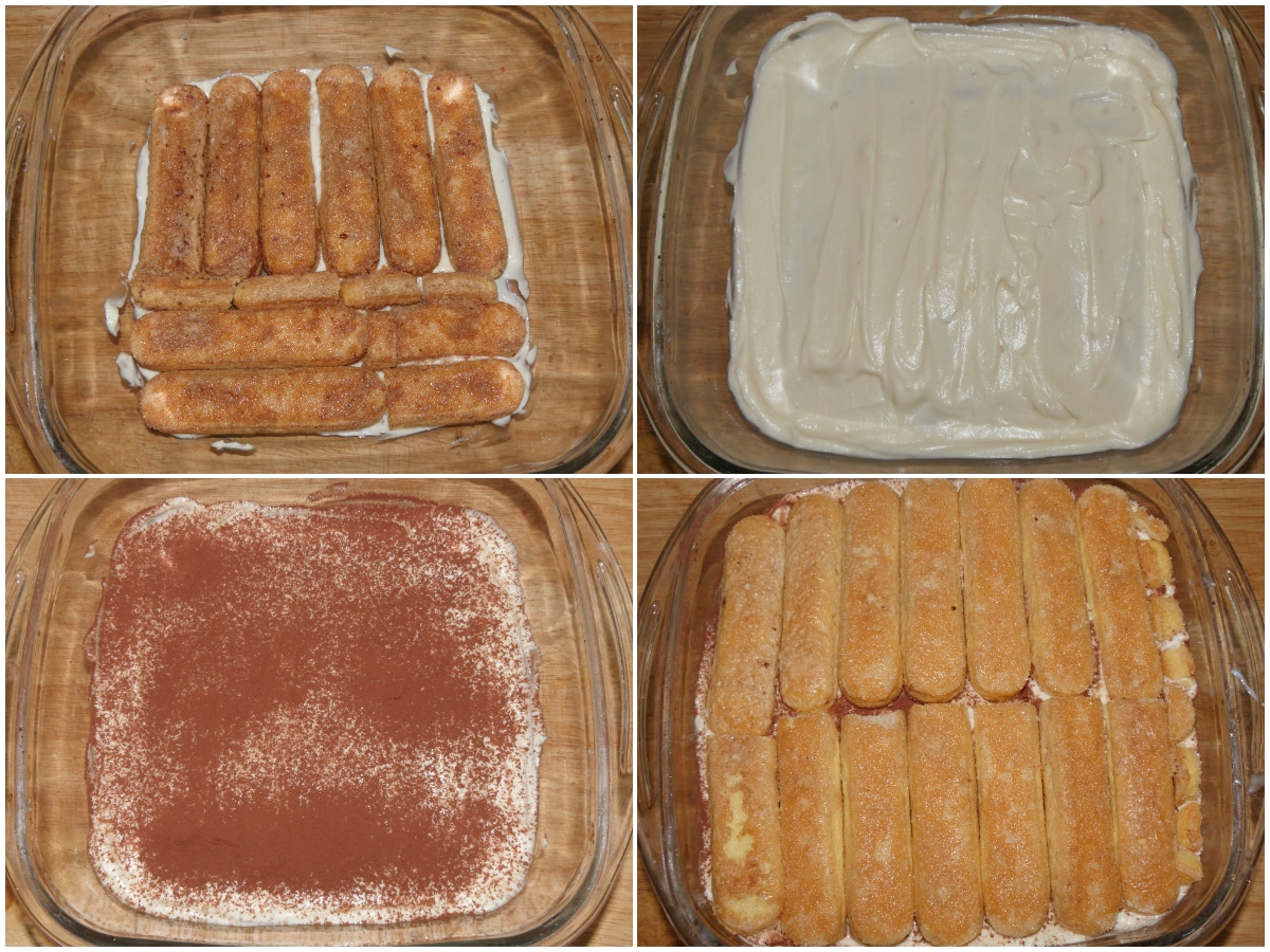 Una volta ottenuto uno strato uniforme di savoiardi, aggiungete uno strato uniforme di crema, un po' di cacao amaro e ripetete.