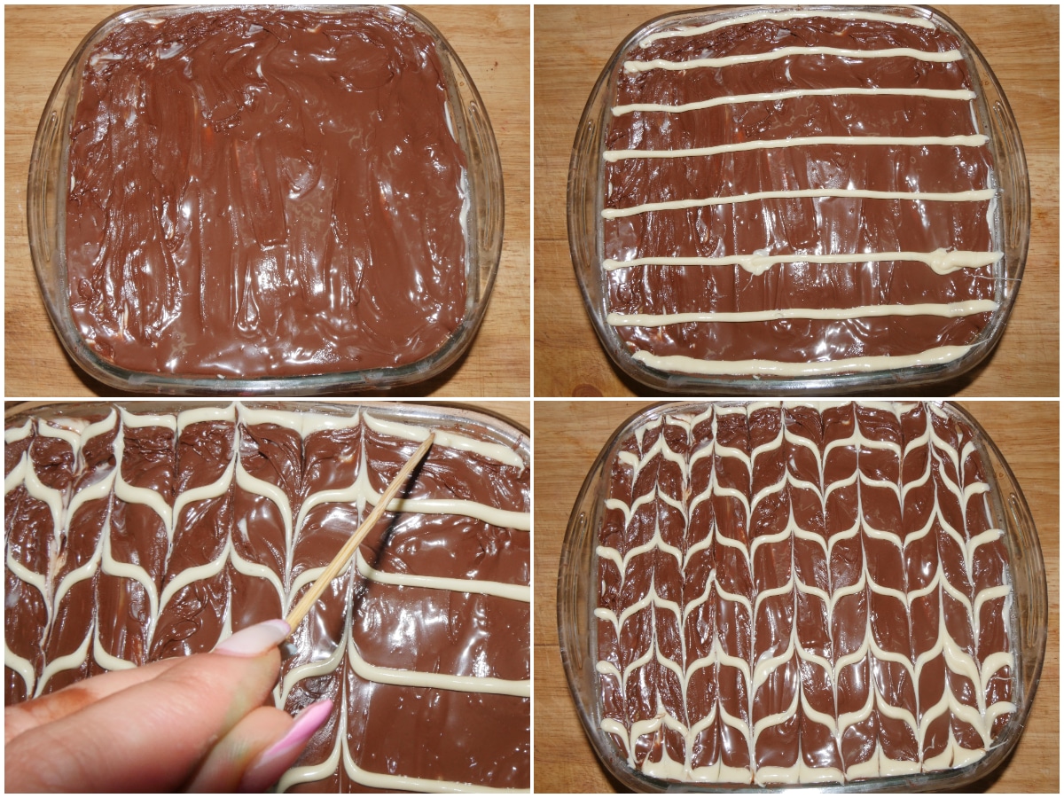 Concludete con uno strato di crema, aggiungete sopra un leggero strato di nutella, create delle striscioline sottili di Nutkao sopra al cioccolato e poi con uno stuzzicadenti create un motivo decorativo (semplicemente trascinandolo una volta in un senso e una volta nell'altro).
