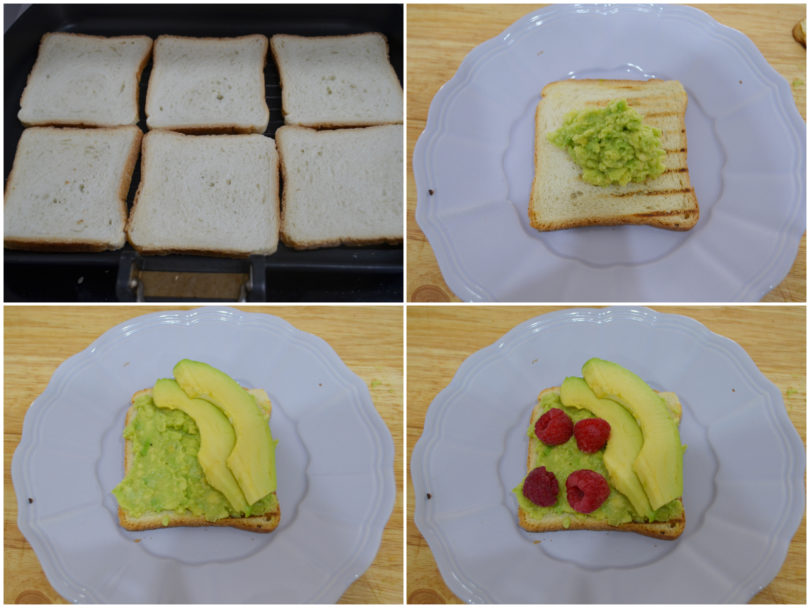 Spalmate la crema di avocado sul pane, quindi aggiungete i lamponi interi e le fettine di avocado.