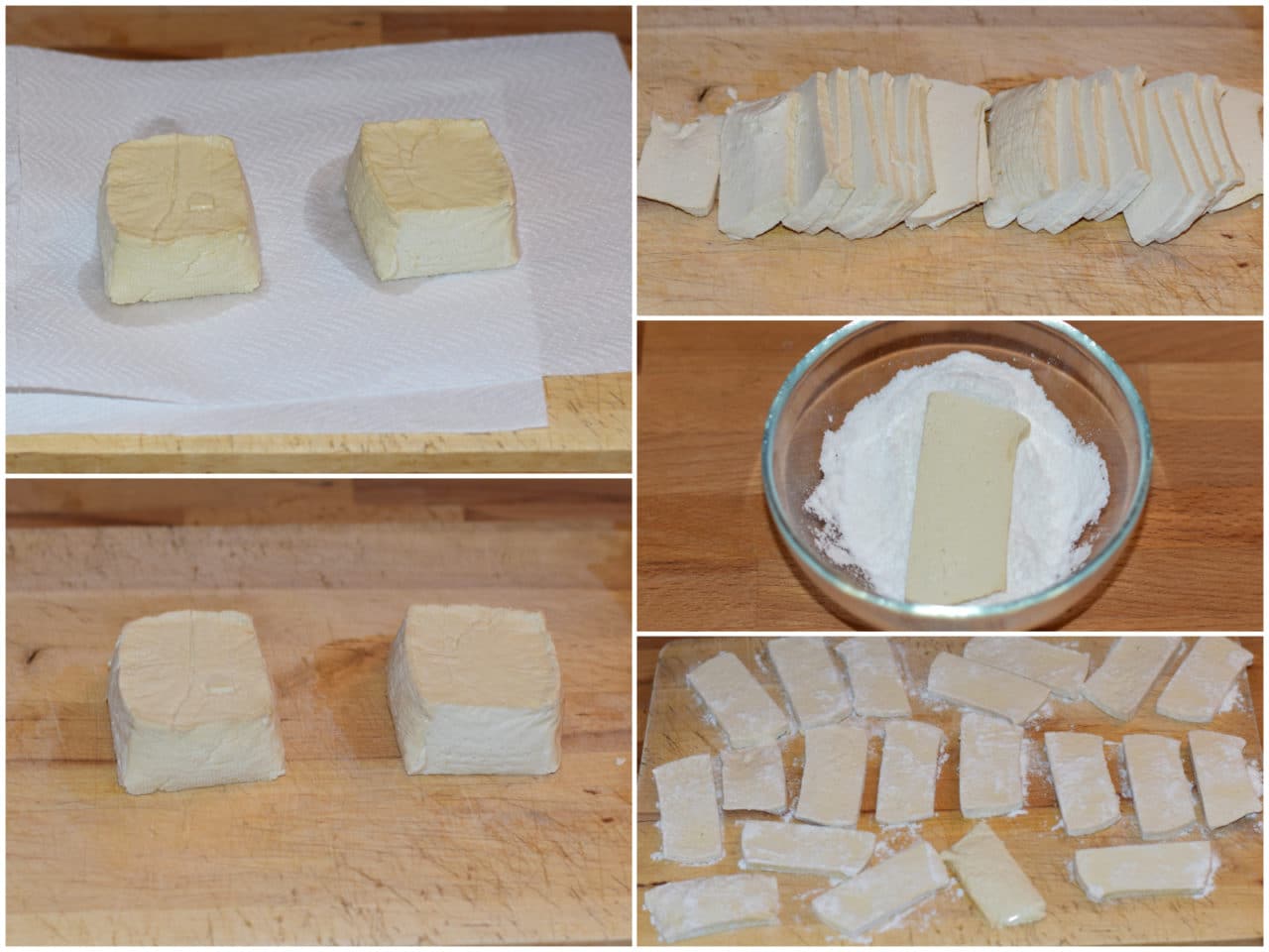 Nel frattempo pressate leggermente i panetti di tofu per far perdere acqua e tamponatelo bene con un canovaccio pulito, quindi tagliatelo a fettine sottili (circa 0,5 cm), poi passatelo nella farina.