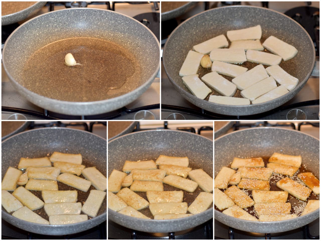 Fate dorare l'aglio in camicia in padella antiaderente con un po' di olio, poi unite le fttine di tofu e lasciatele dorare dai due lati, quindi aggiungete zenzero, salsa di soia e metà dei semi di sesamo.