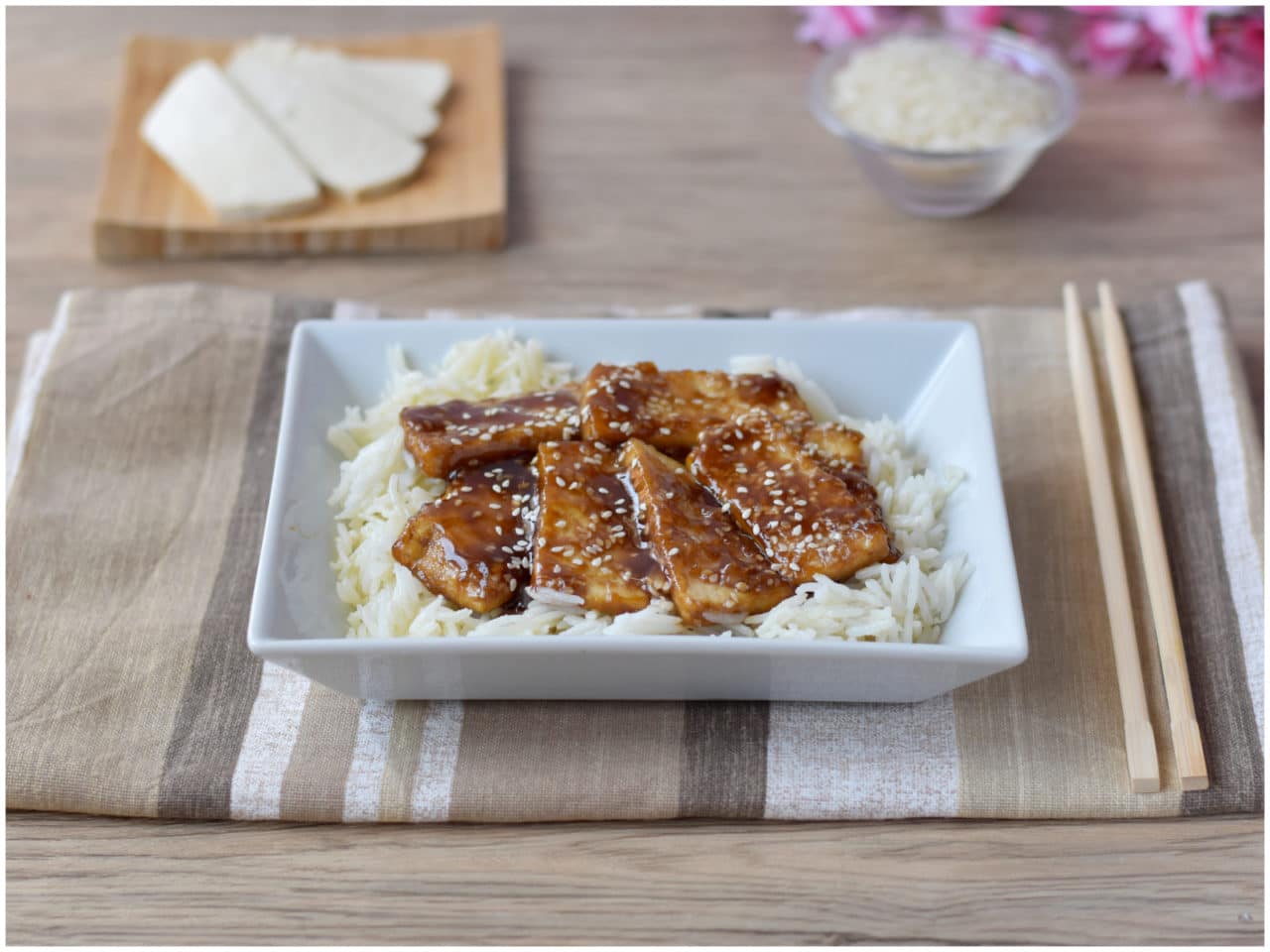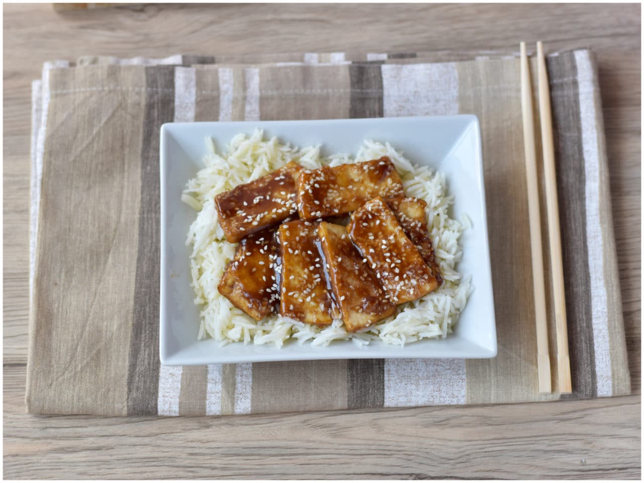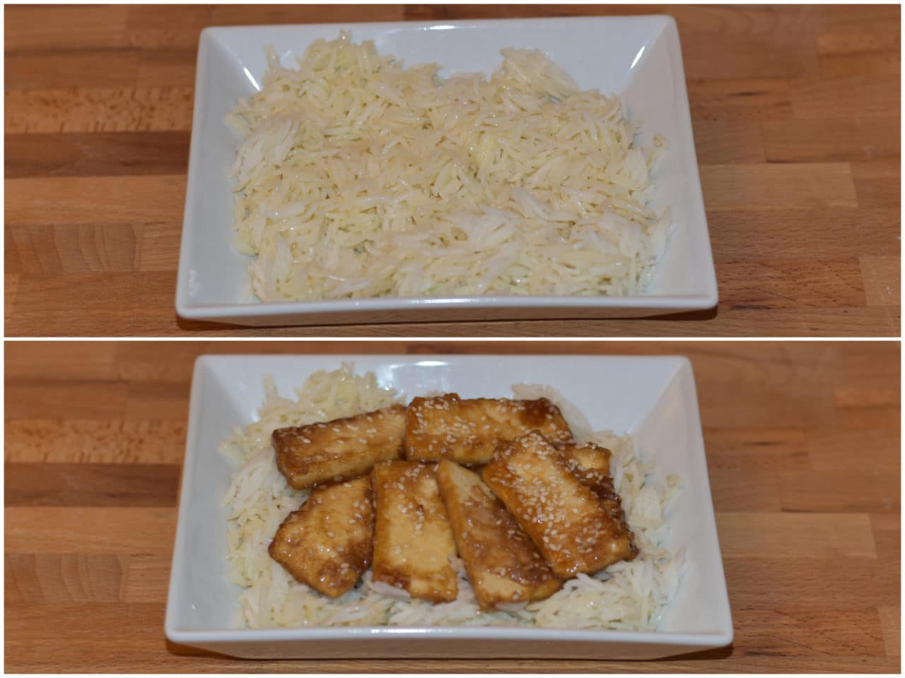 Impiattate mettendo sotto il riso e sopra il tofu glassato.