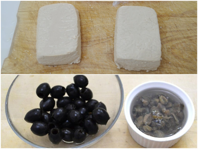 Tamponate il tofu con carta da cucina, denocciolate le olive e dissalate i capperi.