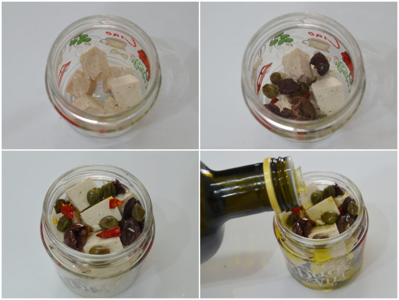 Mettete in un vasetto di vetro sterilizzato: tofu, olive, capperi, origano e il peperoncino a pezzetti.