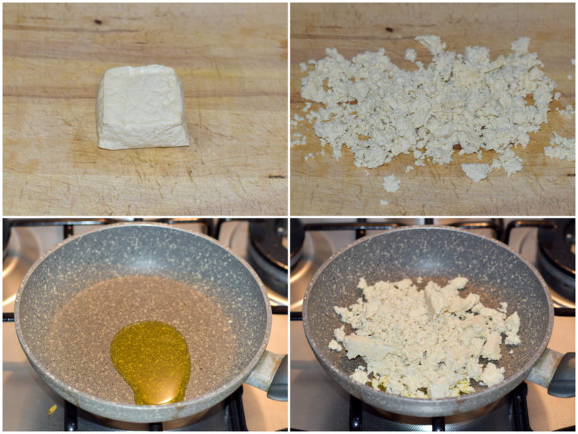 Innanzitutto sbriciolate bene il tofu con le mani, quindi mettetelo in una padella antiaderente in cui avrete fatto scaldare dell'olio.