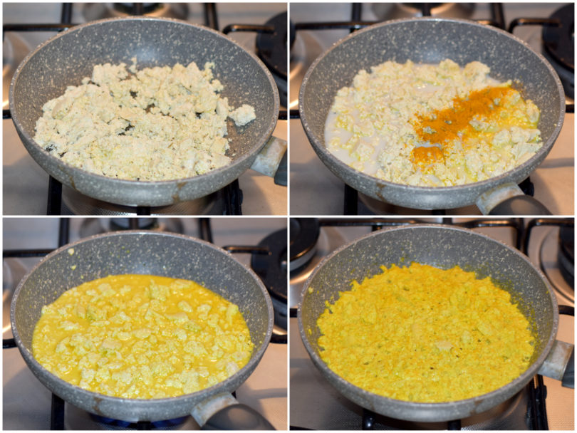 Condite con sale e pepe e cuocete a fiamma media per circa 5 minuti, mescolando spesso, quindi aggiungete latte vegetale e curcuma e mescolate bene, continuando a cuocere mescolando fino ad ottenere una consistenza un po' cremosa.
