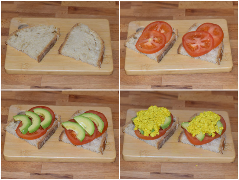 Assemblate il vostro pasto: disponete il pomodoro sul pane (può essere pane fresco o tostato come per gli avocado toast), poi aggiungete l'avocado e infine il tofu.