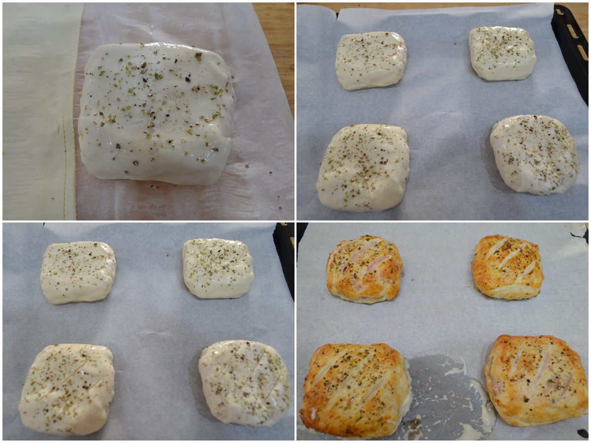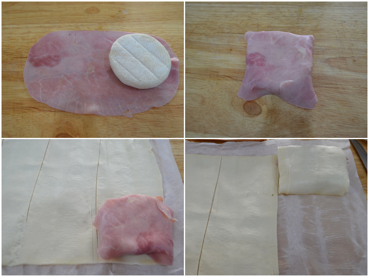 Tagliate la pasta sfoglia in 4 strisce di dimensioni uguali, quindi usatele per racchiudere i tomini, una striscia per ogni tomino nel prosciutto.