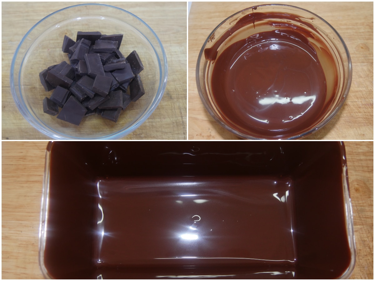 Innanzitutto sciogliete il cioccolato fondente (a bagnomaria o nel microonde), quindi versatelo nello stampo e rivestite bene sia il fondo che le pareti, creando uno strato uniforme.