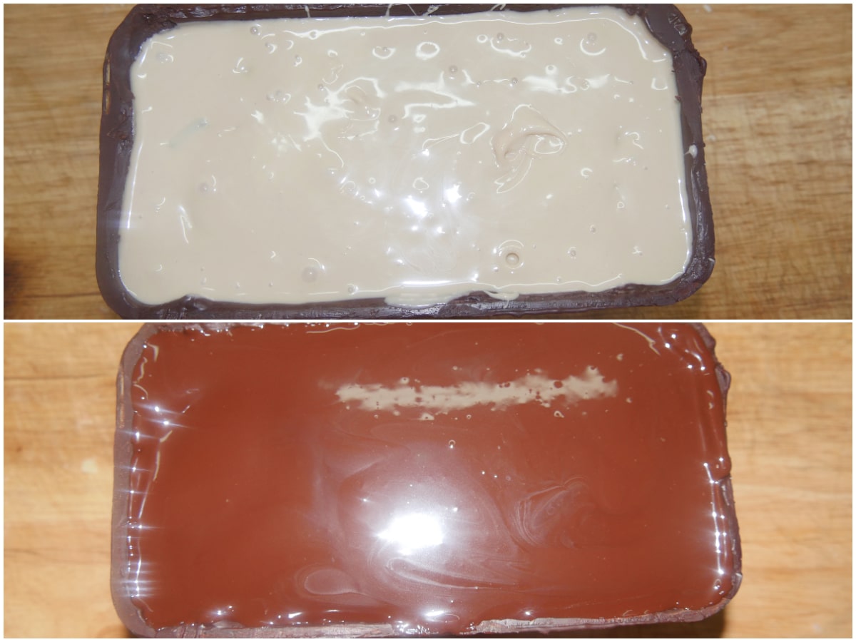 Sciogliete nuovamente il cioccolato fondente, versatene qualche cucchiaio per ricoprire la superficie bianca e lasciate in frigo per 1 ora.
