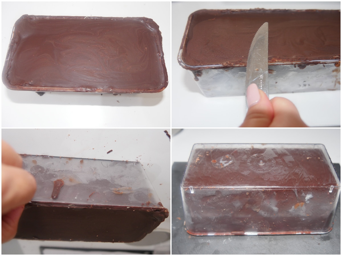 Rifilate i bordi con una lama per eliminare il cioccolato in eccesso, cercate di far entrare aria tra lo stampo e il cioccolato, quindi capovolgete sul piatto da portata: se è entrata aria tutt'intorno, dovrebbe sformarsi da solo.