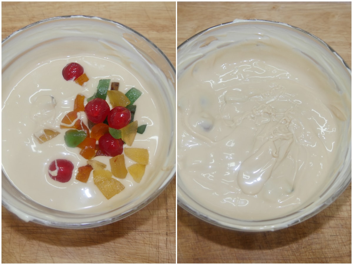 Aggiungete anche i canditi (non tagliateli a pezzi troppo piccoli, deve vedersi bene il colore).