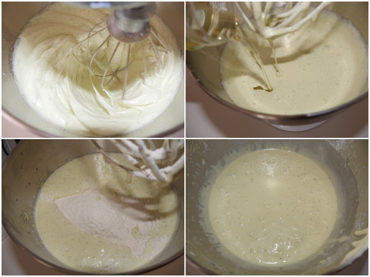 Incorporate acqua, olio, vaniglia e infine farina e lievito setacciati.