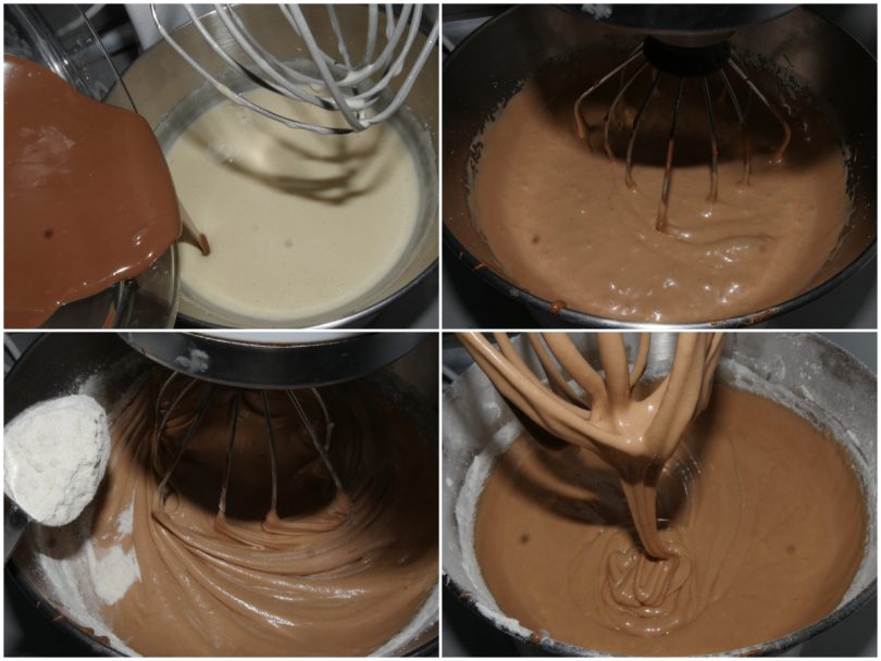 A questo punto potete unire il cioccolato, il sale e poi, poco per volta, farina e lievito setacciati insieme.