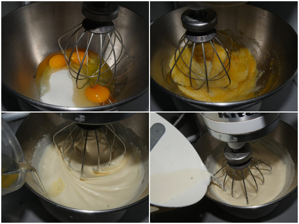 Nel frattempo montate le uova con lo zucchero per 15-20 minuti a velocità alta con le fruste elettriche, quindi abbassate la velocità e aggiungete a filo prima l'olio e poi il latte.