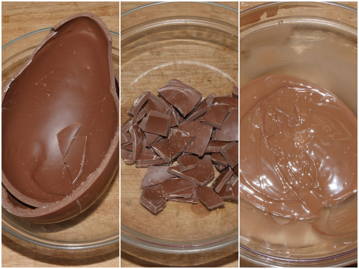Spezzettate il cioccolato e scioglietelo nel microonde (o a bagnomaria), quindi lasciatelo intiepidire.