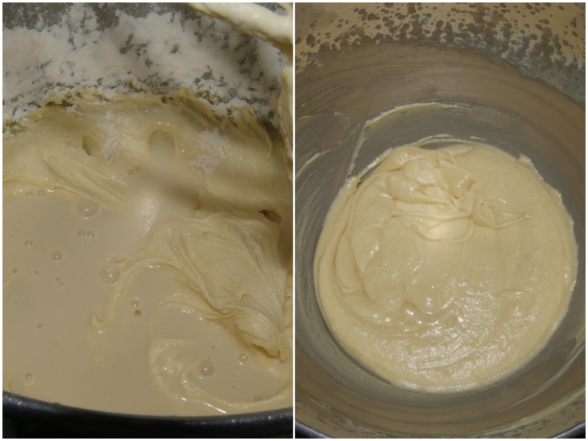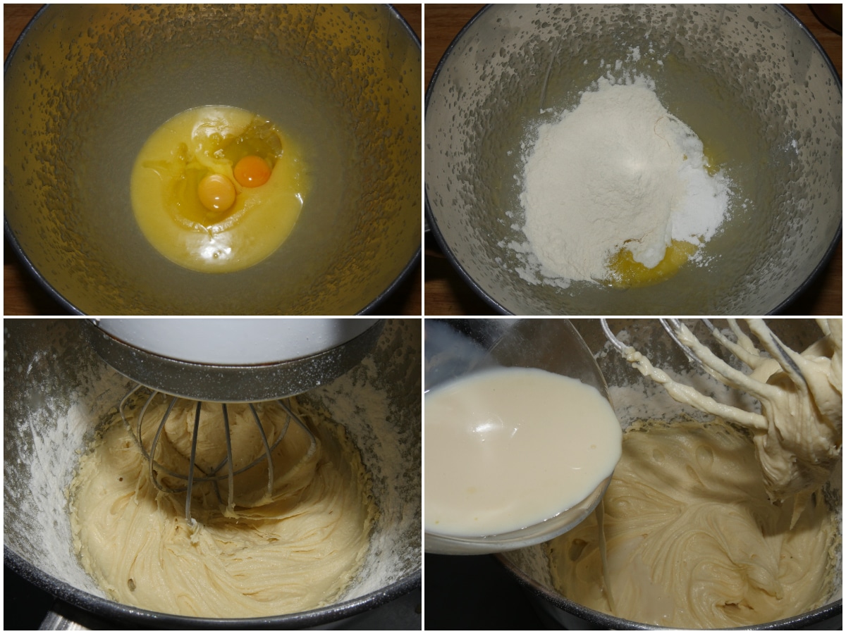 Sciogliete il burro nel microonde o a bagnomaria, quindi aggiungete lo zucchero e montate fino ad ottenere un composto spumoso, poi incorporate le uova, il sale, la vaniglia e farina e lievito setacciati.