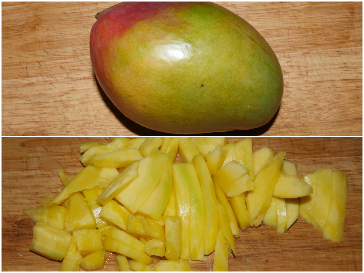 Pulite il mango (qui la guida per farlo al meglio) e tagliatelo a fettine.