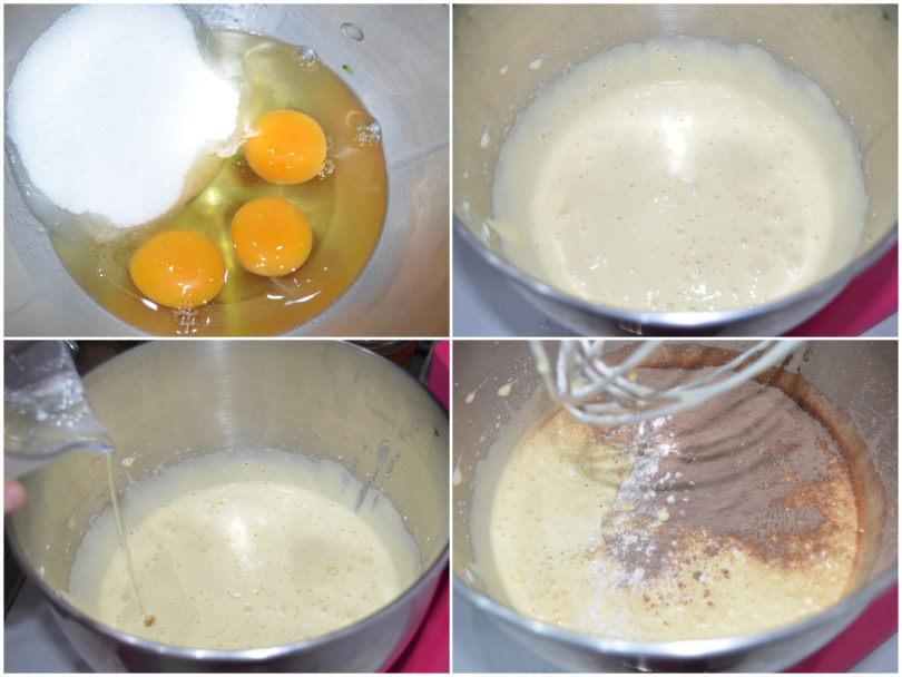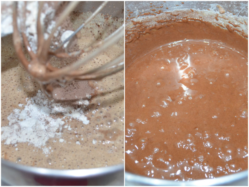 Continuando a montare, aggiungete l'olio a filo e poi iniziate ad unire le polveri setacciate: 2 cucchiai di farina e lievito e 1 cucchiaio di nesquik.